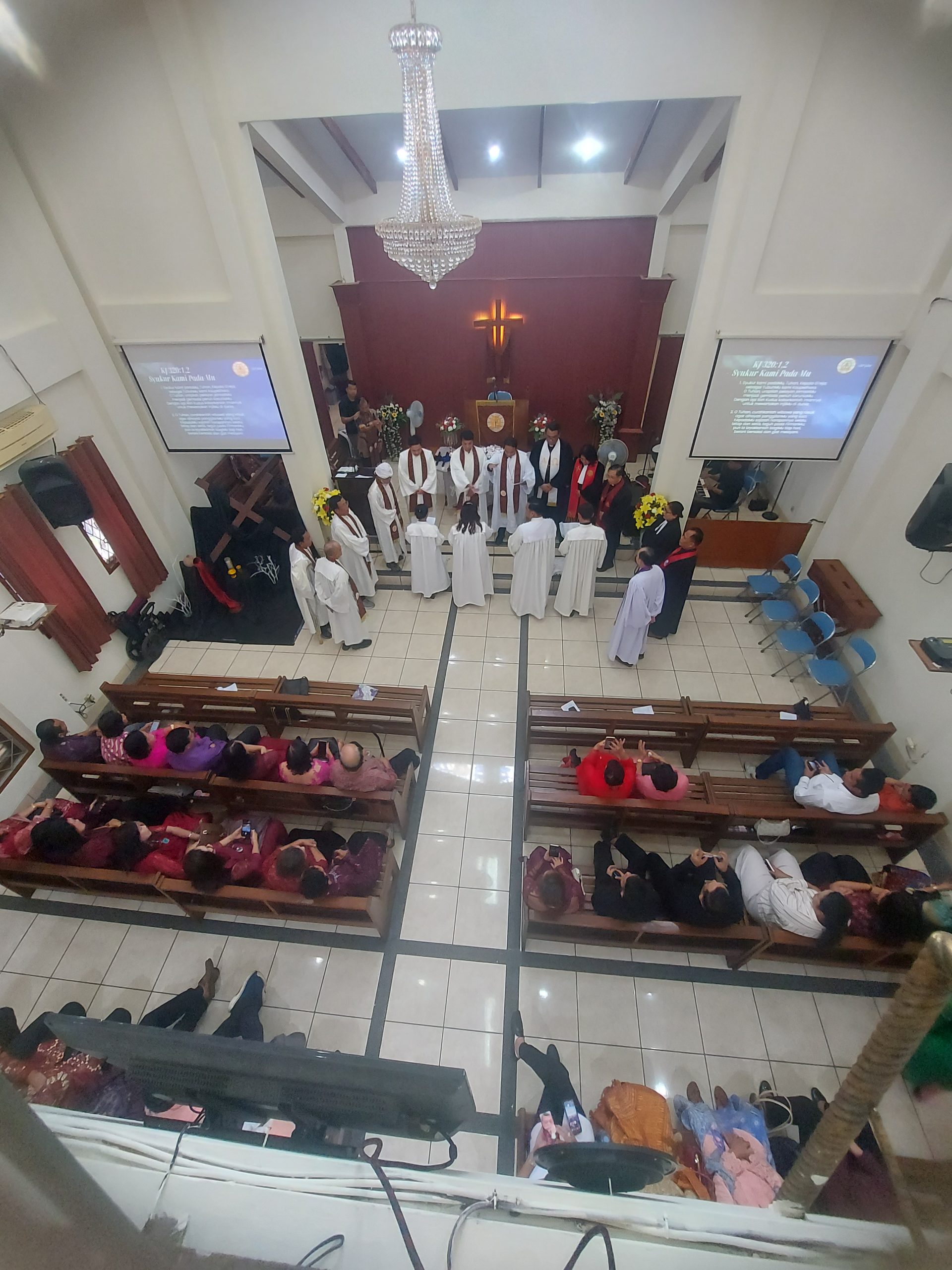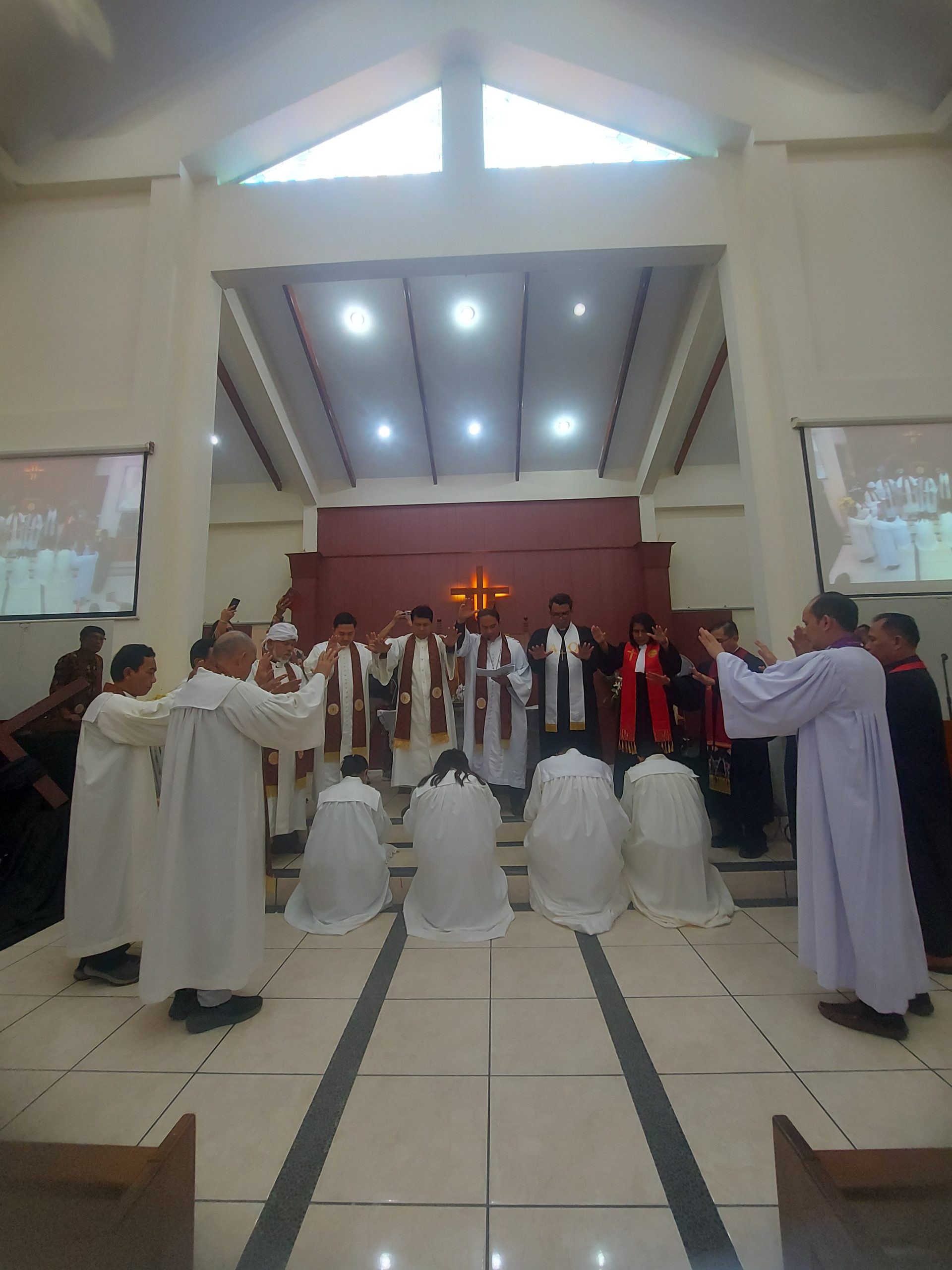 Tampak hadir Ketua Umum Gereja Kristen Pasundan, Pendeta Magyolin Carolina Tuasuun saat menumpangkan tangan bersama pendeta-pendeta GKP Jabar, selain pendeta-pendeta gereja-gereja tamu, yang juga menumpangkan tangan bagi pendeta-pendeta baru. Selamat melayani untuk semua pendeta baru GKP Jabar.